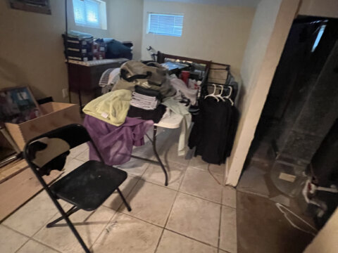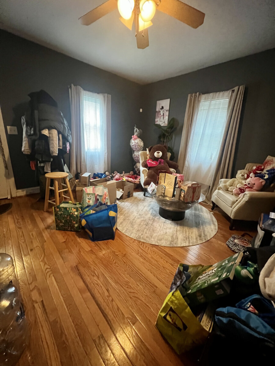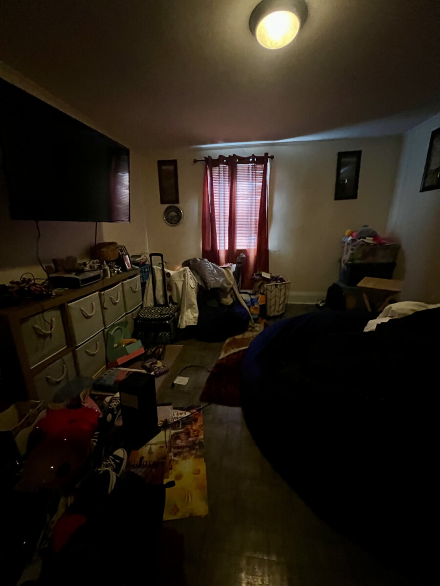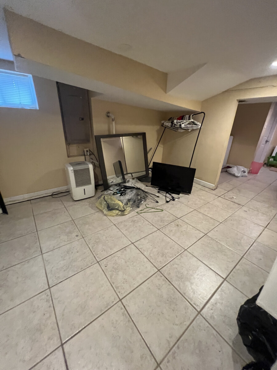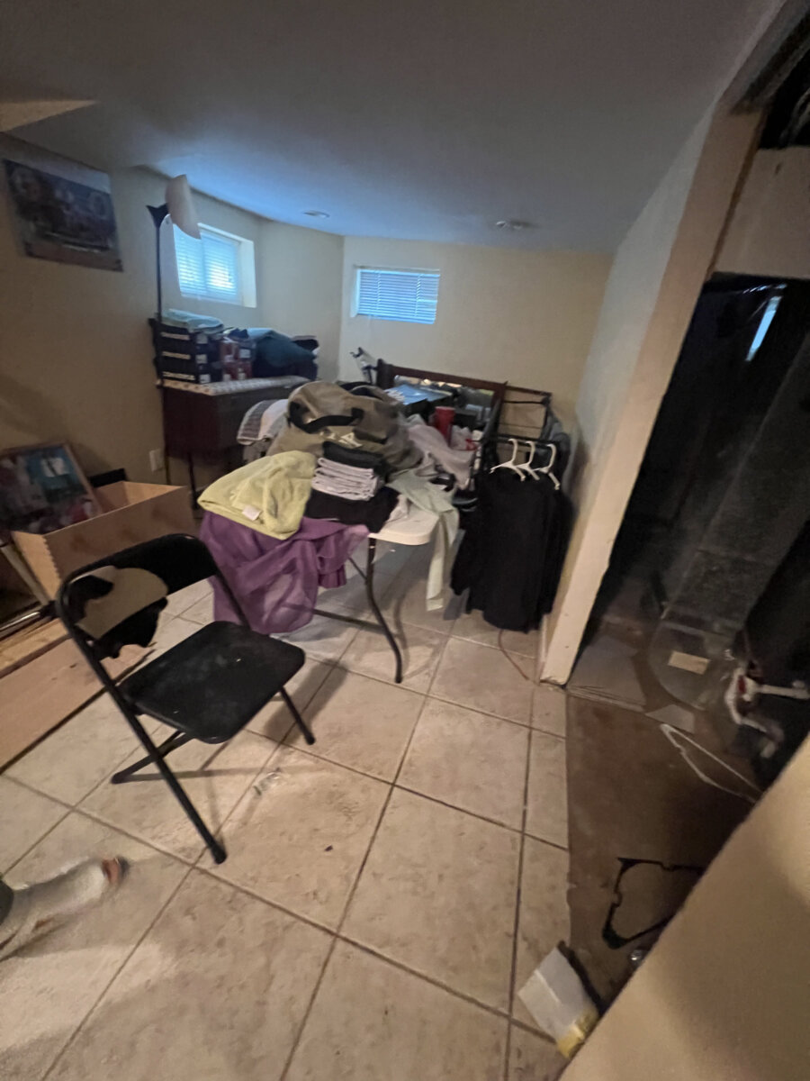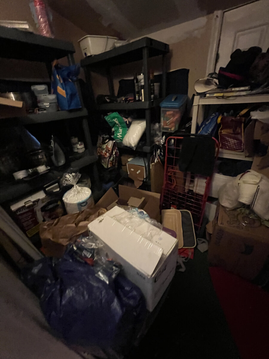 - Main level: hardwood floors in primary living areas; cluttered but usable layout once cleared.